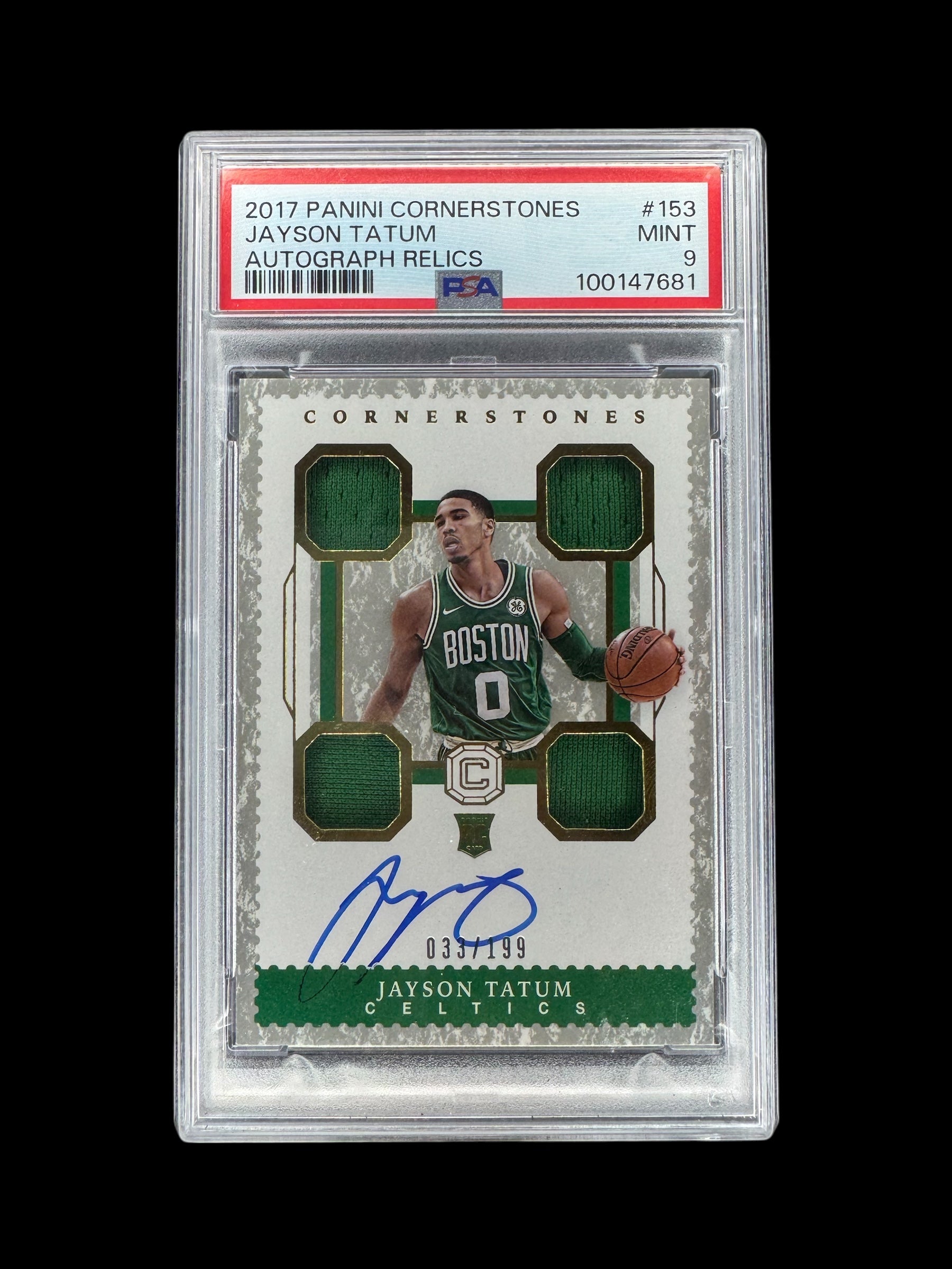 2017 PANINI CORNERSTONES JAYSON TATUM CELTICS QUAD ROOKIE PATCH AUTO #/199 PSA 9