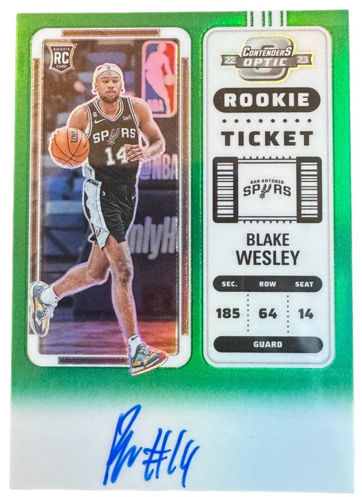 This 2022-23 Panini Contenders Optic Blake Wesley Rookie Ticket sports trading card features an on card autograph and is numbered out of 75. The card is in near mint or better condition and is a must-have for San Antonio Spurs fans and collectors alike.