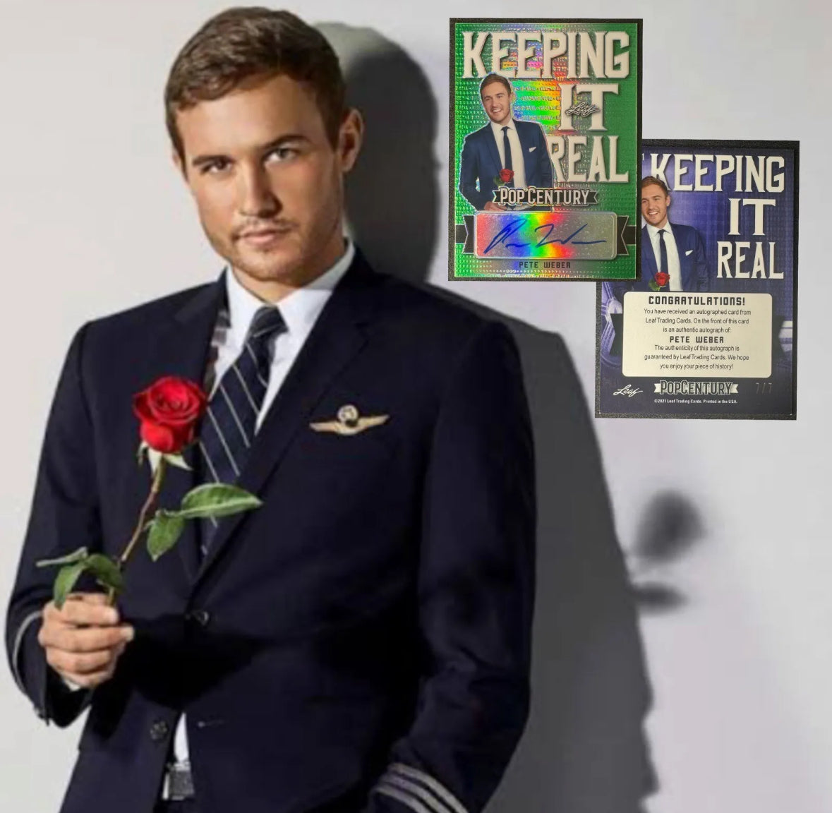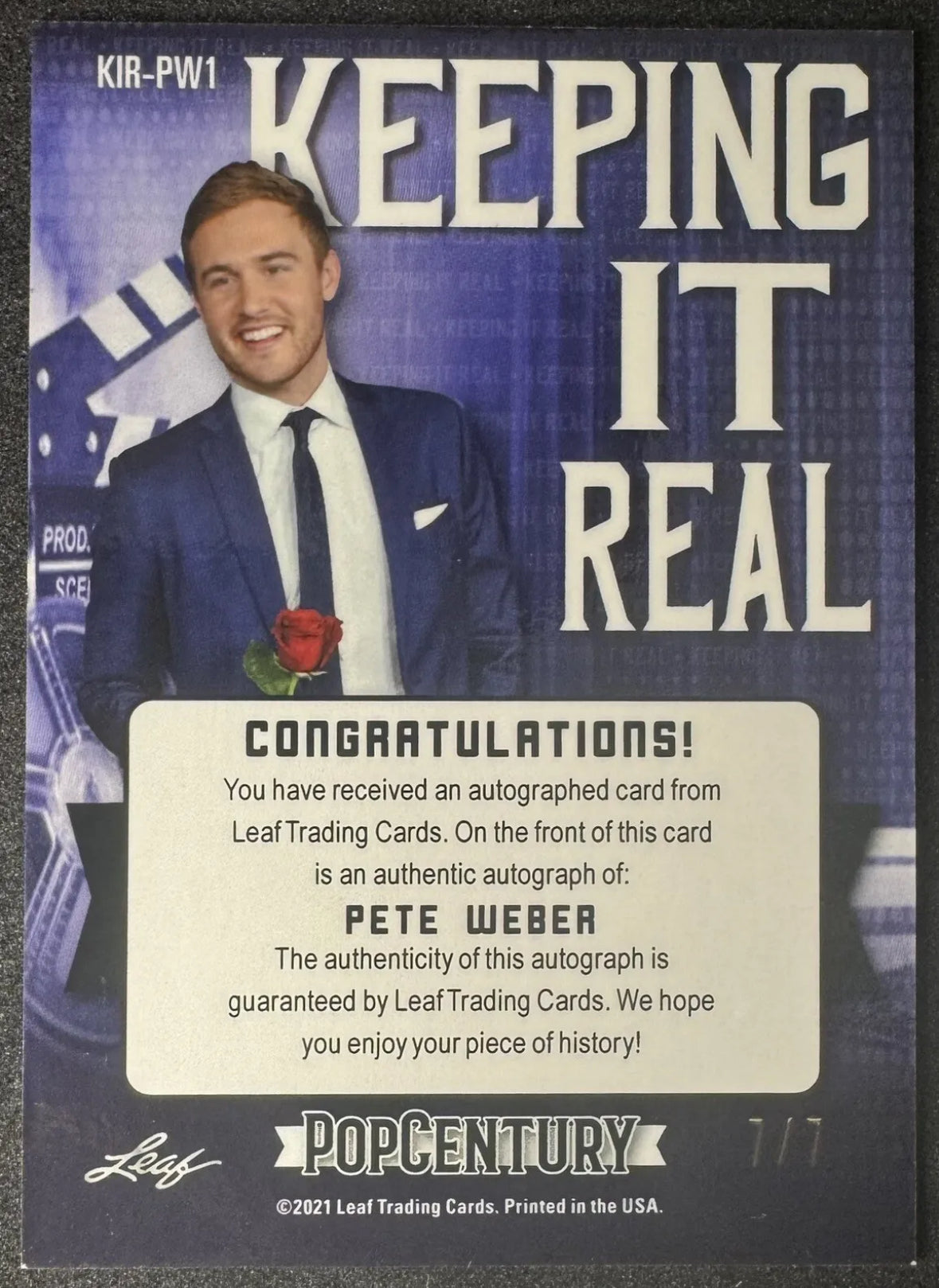 This 2021 Leaf Pop Century Metal card features a prismatic green parallel/variety of Pete Weber Keeping It Real. The card is autographed by the popular Bachelor personality, Pete Weber, and has a print run of only 7. The card is in near mint or better condition and is serial numbered.